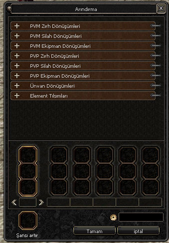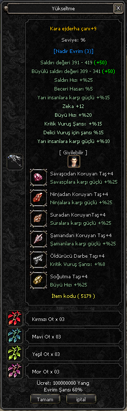 | Seyrek Evrim +30 STR | 2x Kırmızı , x2 Mavi , x2 Mor x2 Yeşil ot ve Evrim Metali karşılığında yapılır 50m yang ister |