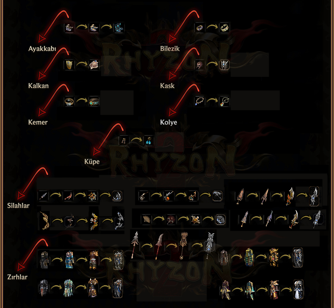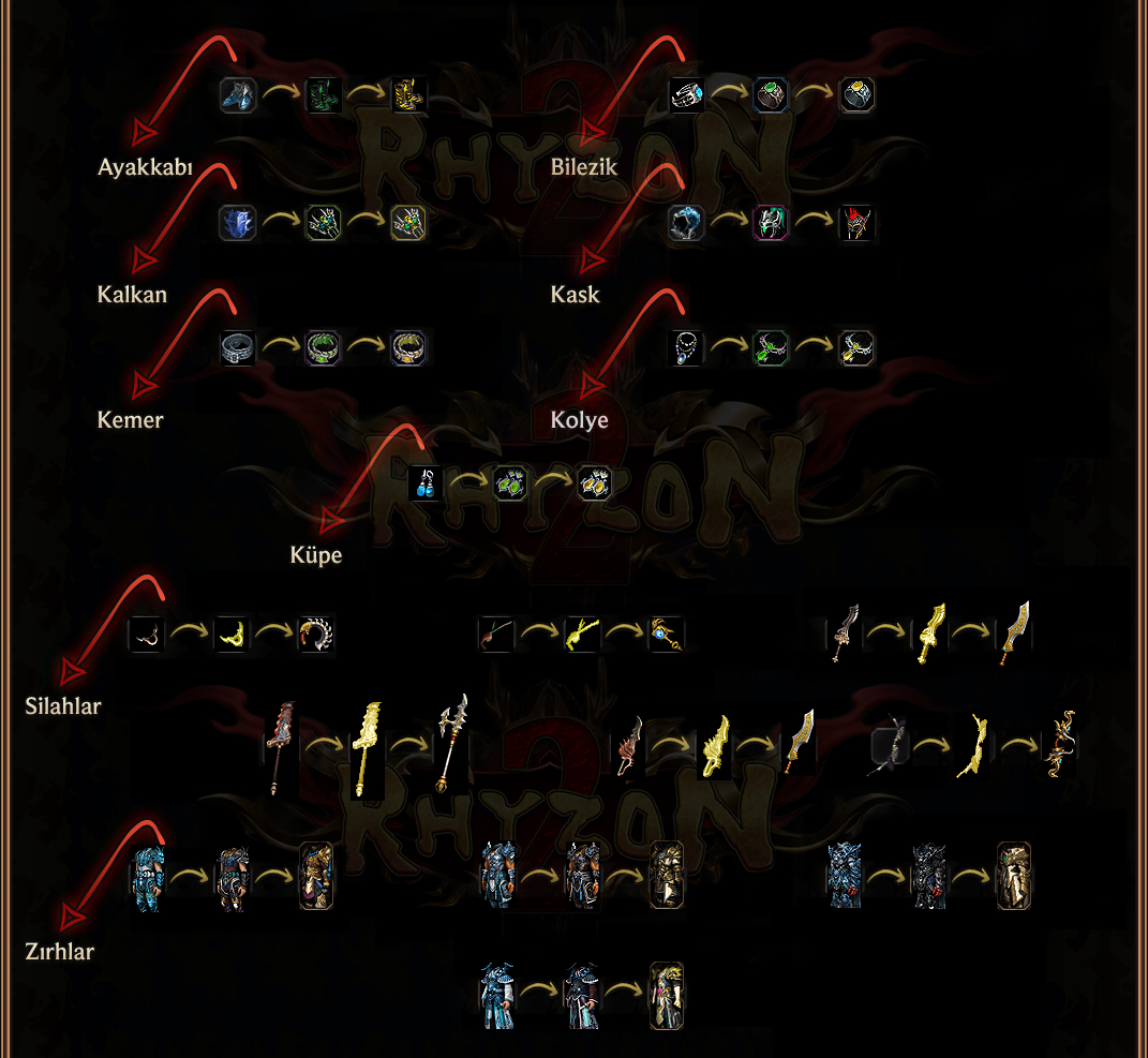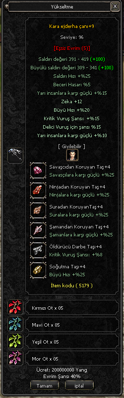 | Efsane Evrim +70 STR | 4x Kırmızı , x4 Mavi , x4 Mor x4 Yeşil ot ve Evrim Metali karşılığında yapılır 150m yang ister |